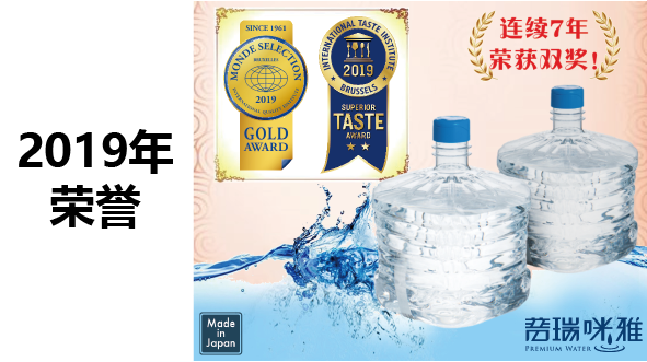 2019年世界品质评鉴大会(MONDE SELECTION)和国际风味暨品质评鉴所(iTQi),普瑞咪雅富士山天然矿泉水连续7年荣获双奖。